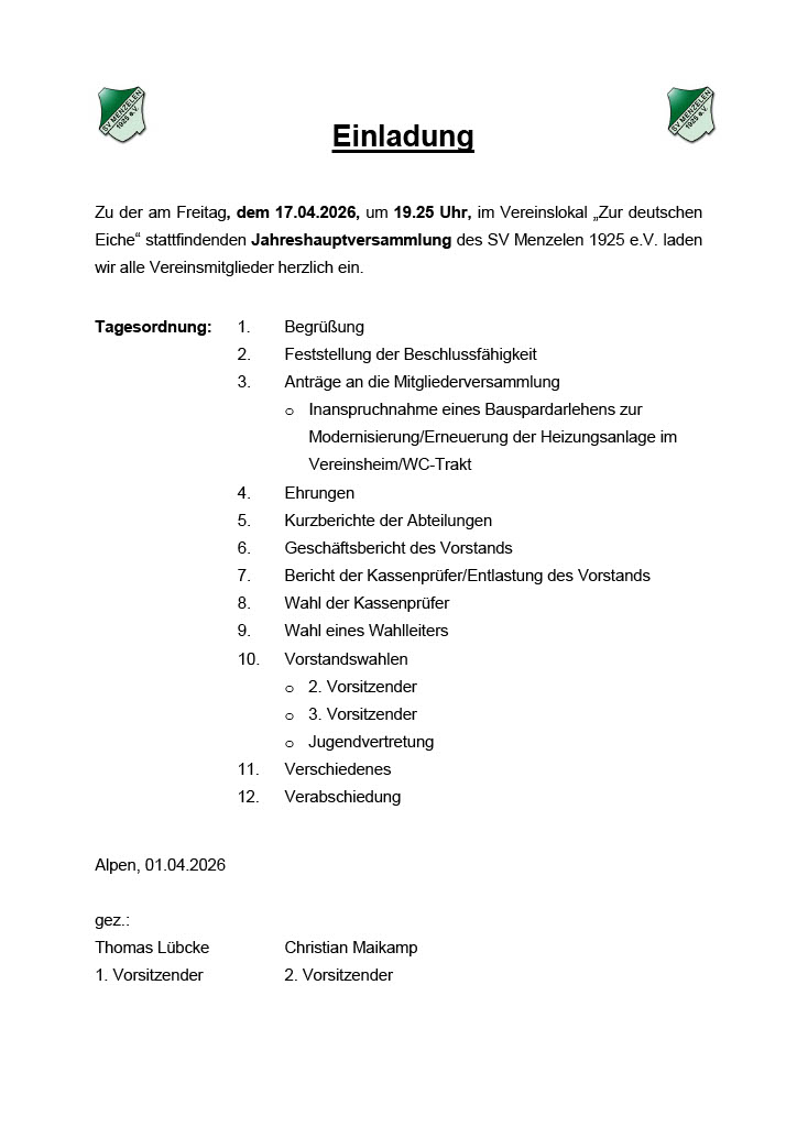 Unsere Jahreshauptversammlung findet am 17.04.2026 um 19.25 Uhr, in der Gaststätte Zur Deutschen Eiche statt.